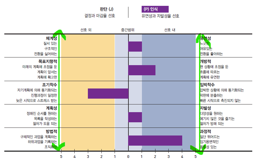 그리고 체계성vs유연성, 계획성vs자발성의 지표는, "중간범위"를 나타내고 있습니다.