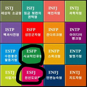 제 아내는 ESFP (사교적인 유형) 저는 ESFJ(친선도모형)입니다.
