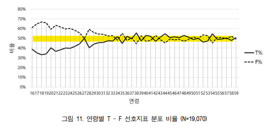 25세 이전에는 확실히 F 지표가 많아요, 그리고 20대 후반으로 가면서 T와 F가 비슷해지기 시작합니다.