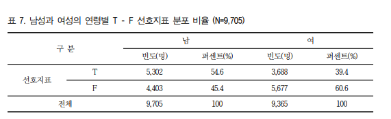 일반적으로 남자는 T, 여자는 F 유형이 많다고 이야기 하는데