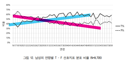 와.. 재밌는ㅌ 지표네요, 어릴때는 F가 좀 더 우세했던 반면, 20대 중후반을 기점으로 T 가 확연히 치고 나갑니다.