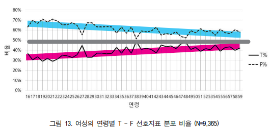 어릴때는 F가 많은데, 나이들수록 T 가되어간다는 지표도 좀 보겠습니다.