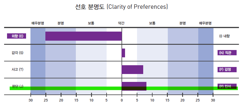아래 보시는 것 처럼, 이 친구는 ENFP인데, E는 분명이고, 우리가 보고 있는 "인식(P)" 지표는 "보통"임을 알 수 있죠?