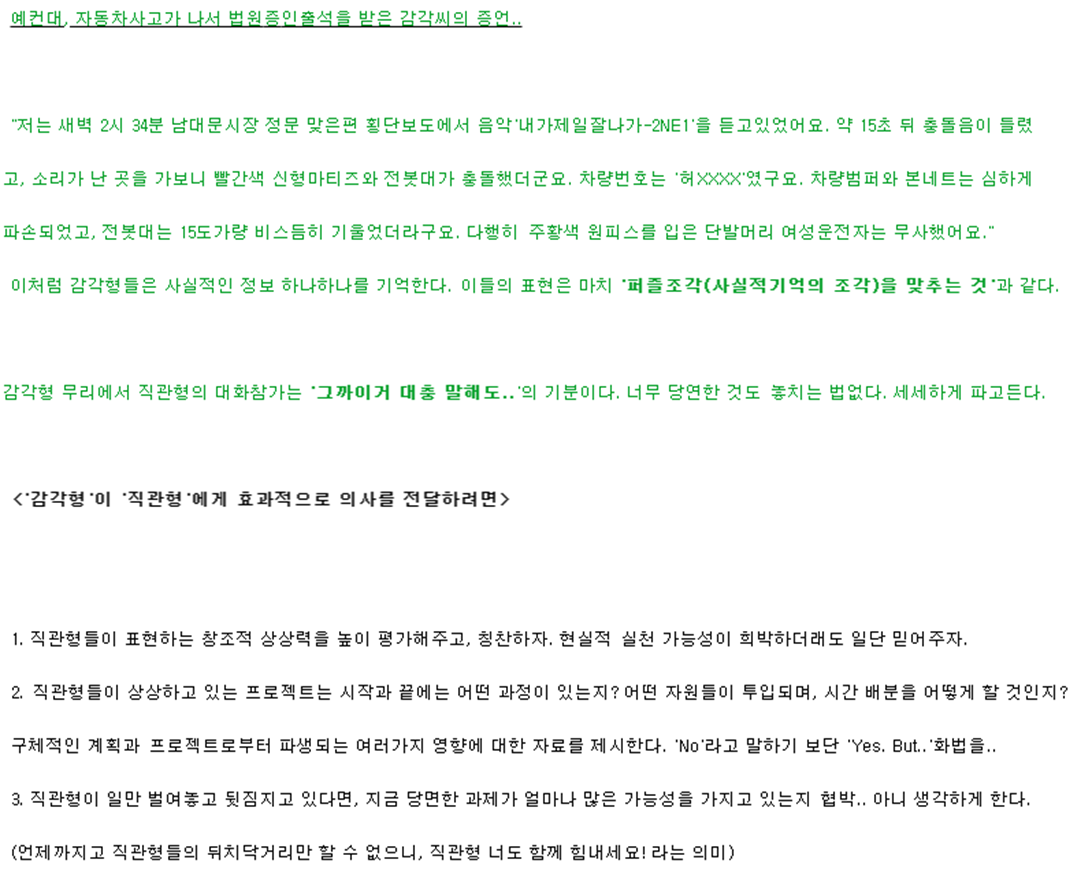 이와 다르게, 직관 유형은 오감이 아닌 육감을 사용한다고 생각하시면 편합니다.