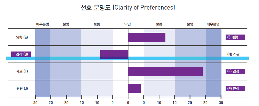 보시는 것 처럼 S와 N 중 선호 분명도는 감각(보통 - 수치로는 9 정도)입니다.